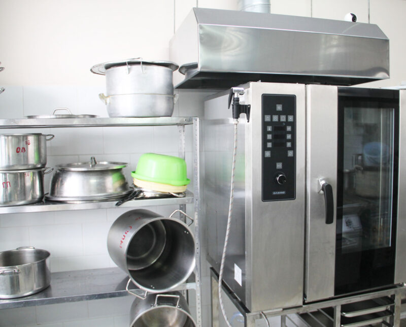 Першае, што кідаецца ў вочы на кухні – чысціня і парадак. Усё блішчыць, кожны прадмет на сваім месцы. Сучаснае абсталяванне дазваляе рыхтаваць ежу хутка і якасна. Да пачатку новага навучальнага года ўстанова атрымала новы параканвектамат.