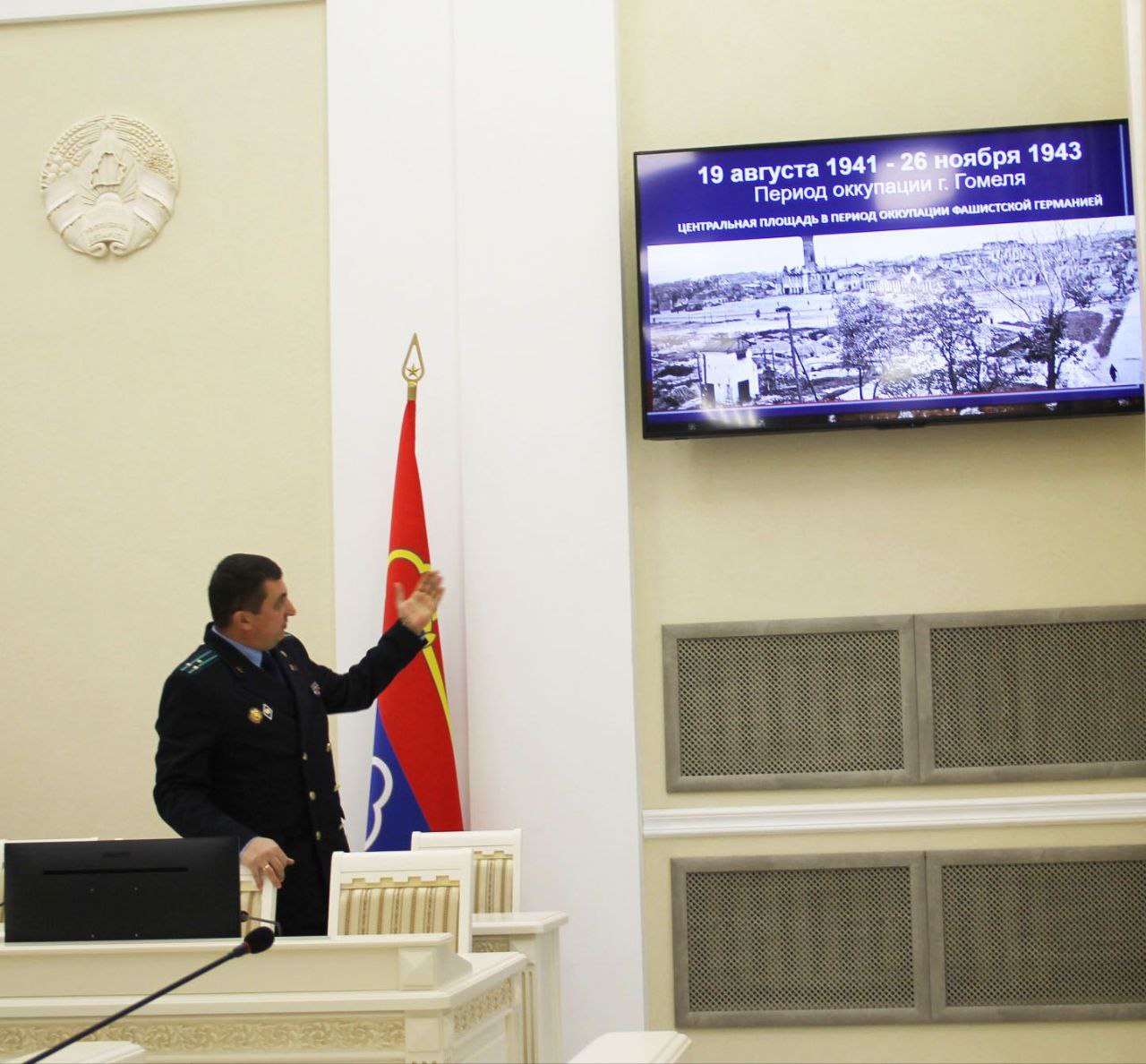 Прадстаўнік нагляднага ведамства зрабіў кароткі экскурс у гісторыю краіны і больш падрабязна спыніўся на страшных падзеях перыяду акупацыі Гомеля фашыстамі. Расказаў пра масавы вываз людзей у нямецкае рабства, знішчэнне простых мірных жыхароў, катаванні ў лагерах смерці і гета. Для нагляднасці на прэзентацыі былі прадстаўлены дакументы і фатаграфіі, знойдзеныя ў архівах. Іх збор і аналіз вядзецца дагэтуль.