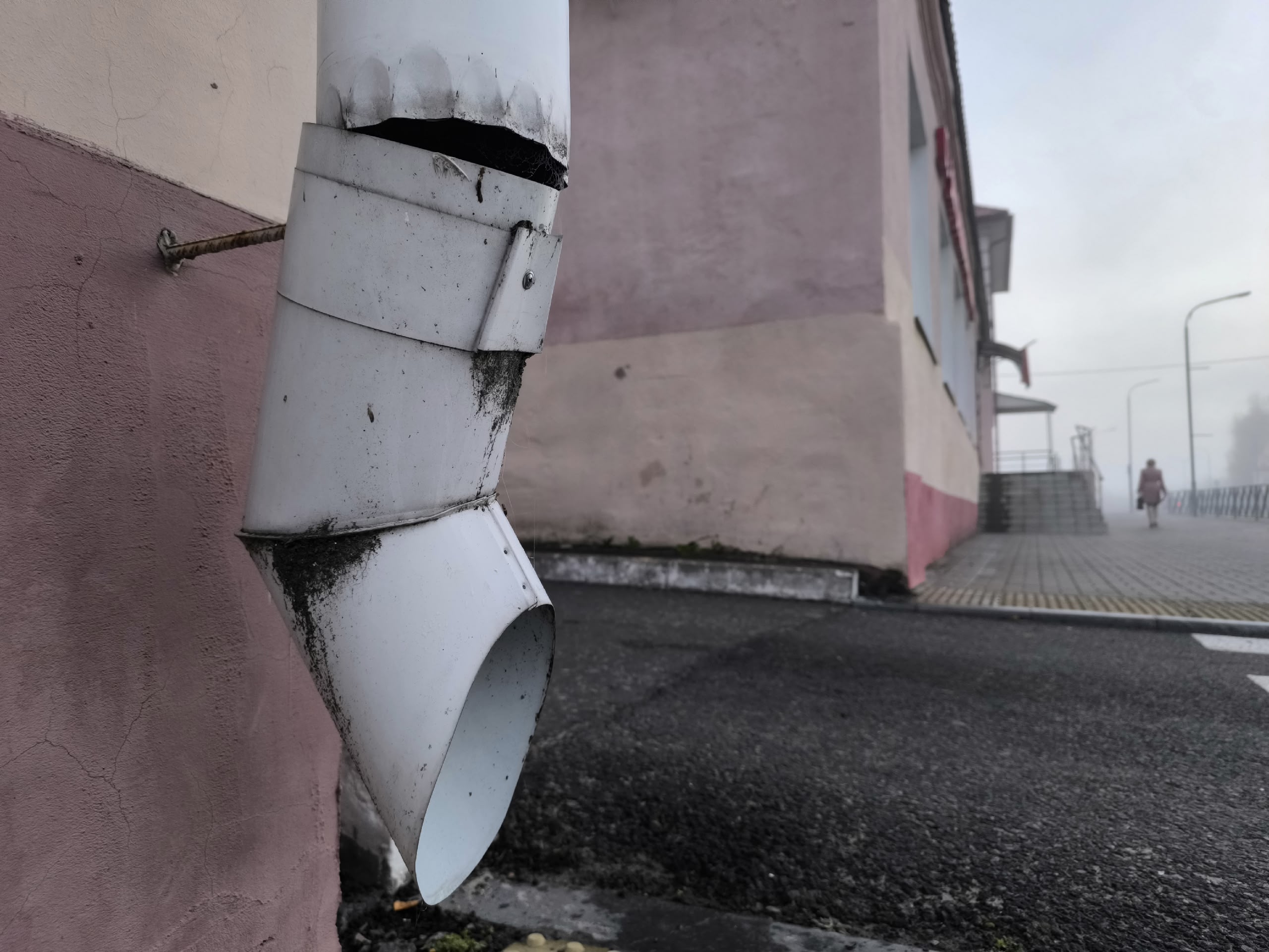 Вось такую вадасцёкавую трубу мы сустрэлі на шматпавярхоўцы па вуліцы Гагарына. Цэнтр горада і такое…