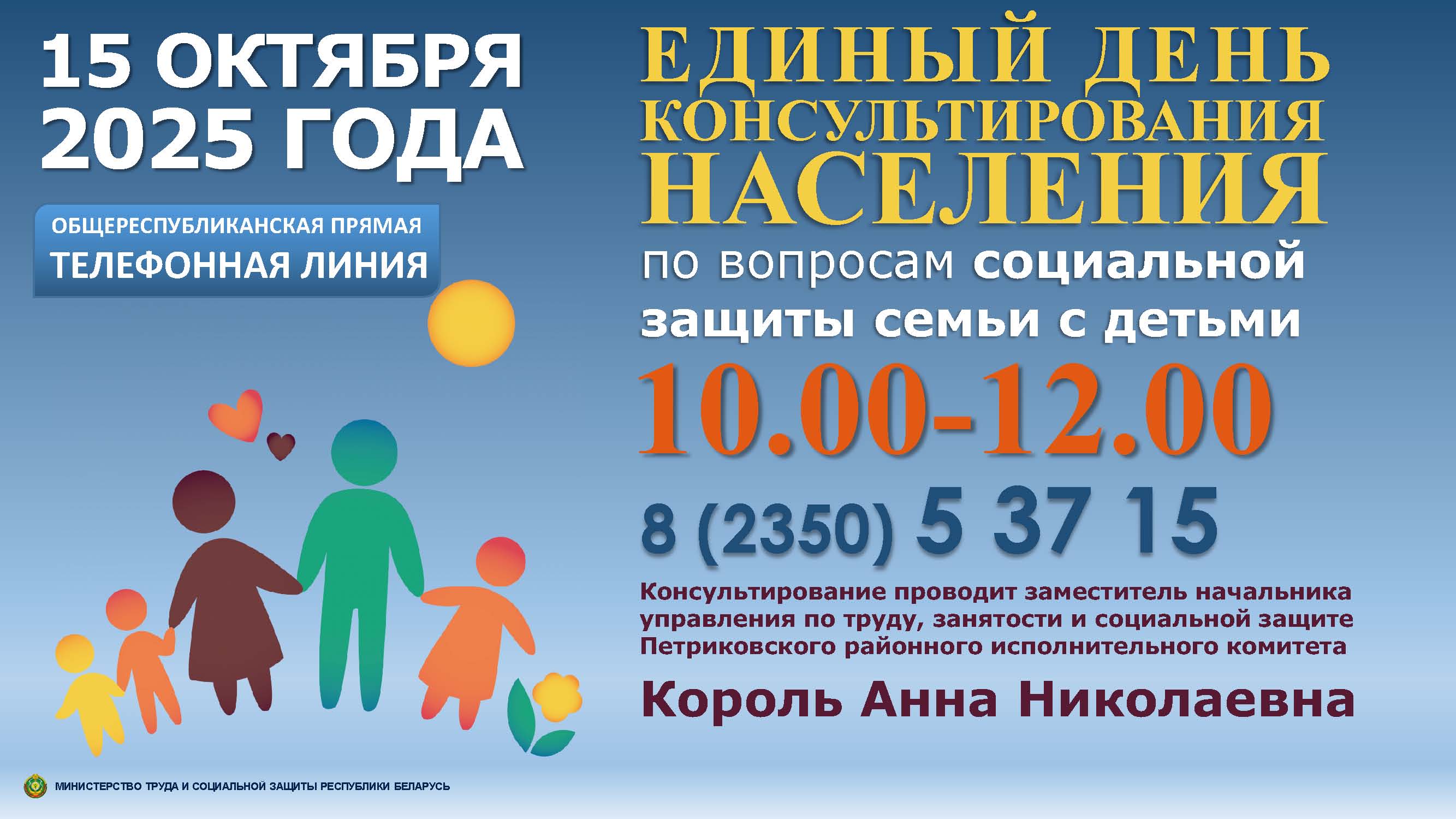 ДА ВЕДАМА Единый день консультирования населения по вопросам социальной защиты семей с детьми Па Петрыкаўскiя навiны - 14.10.2025 0 122 Поделиться в Facebook Твитнуть в Twitter