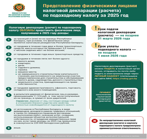 Срок предоставления физическими лицами налоговой декларации по подоходному налогу за 2025 год истекает 31 марта 2026 года.