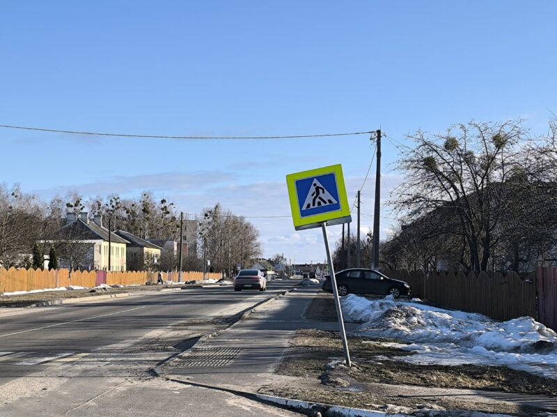 Так, на вуліцы Бумажкова (арыенцір – РАНС) барацьба са стыхіяй скончылася пашкоджаннем дарожнага знака. Мабыць, пад націскам магутнага каўша ці цяжкага снежнага вала стойка знака “Пешаходны пераход” не выстаяла і сарамліва схілілася. Выглядае гэтая карціна, мякка кажучы, неэстэтычна. Але эстэтыка – паўбяды. Дарожны знак – гэта не элемент дэкору, а пытанне бяспекі.