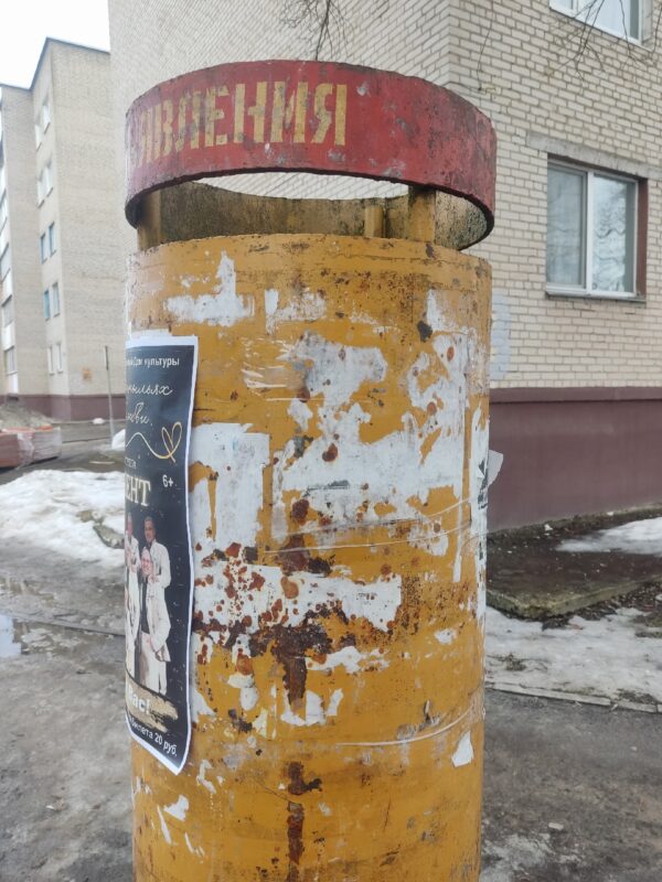 Дакладней – яе знешні выгляд. Фарба, якая калісьці, магчыма, надавала ёй прывабны выгляд, даўно страціла сваё прызначэнне. Непрыемнае ўражанне пакідаюць абрыўкі паперы, якія заляпілі стэнд і практычна сцёрты надпіс “Объявления”.