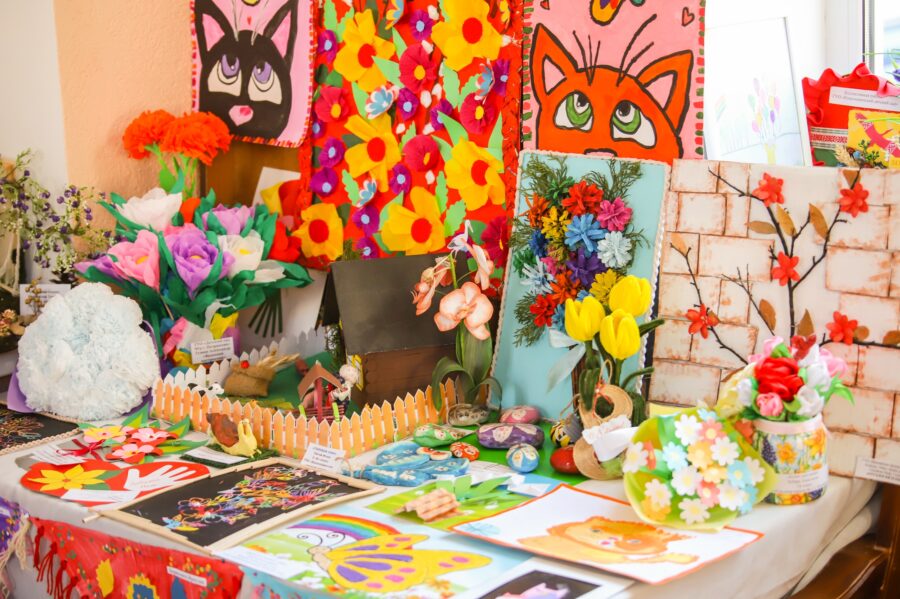 Тут можна ўбачыць і тонкае бісерапляценне, і вышыўку ніткамі, і вырабы ў стылі макрамэ, і нават фігуркі з цеста. Асаблівае месца займаюць малюнкі – яркія, эмацыянальныя. Дзяўчынкі і хлопчыкі з душой і любоўю перанеслі на паперу свае думкі і мары.